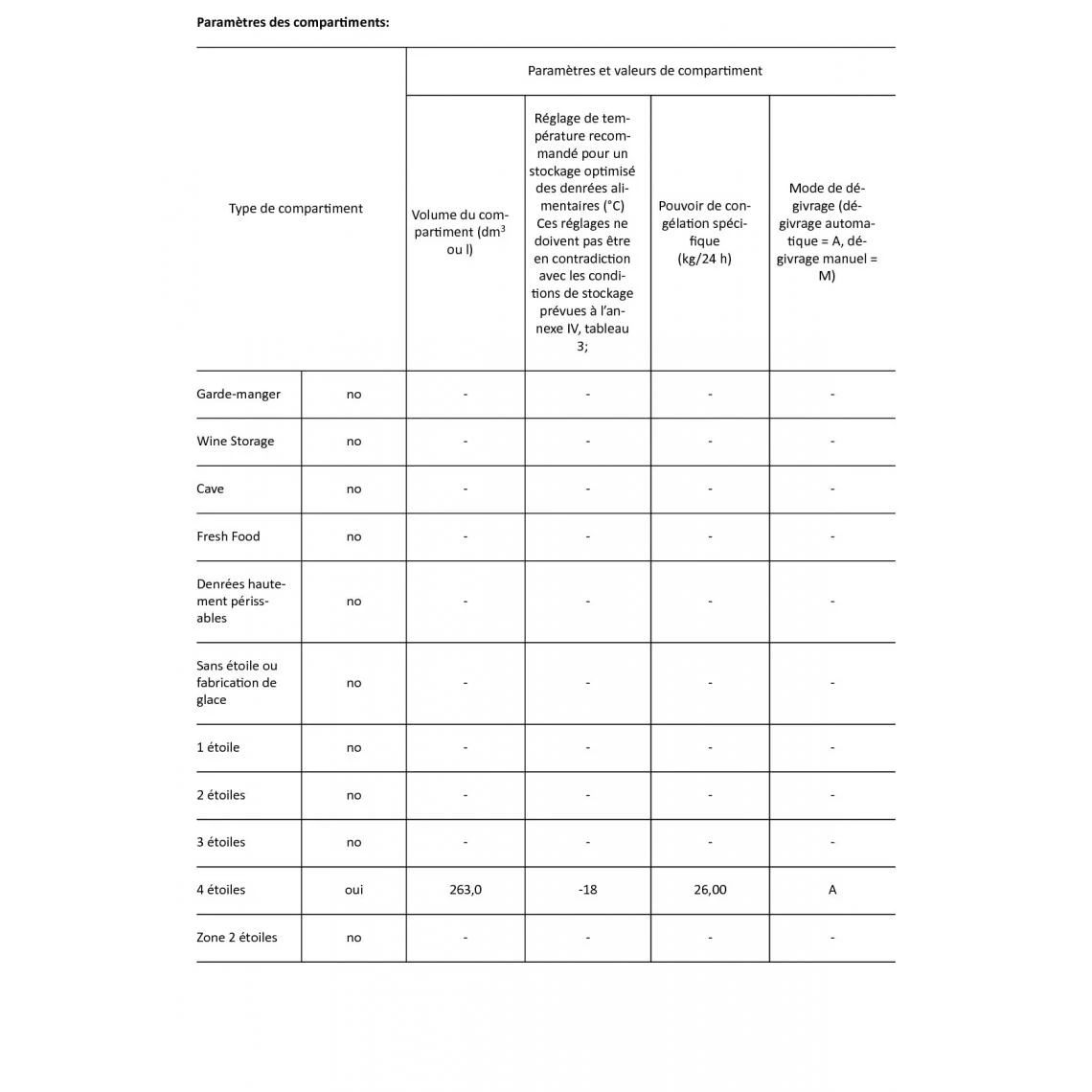 Volume du compartiment 4 étoiles (L) : 263.