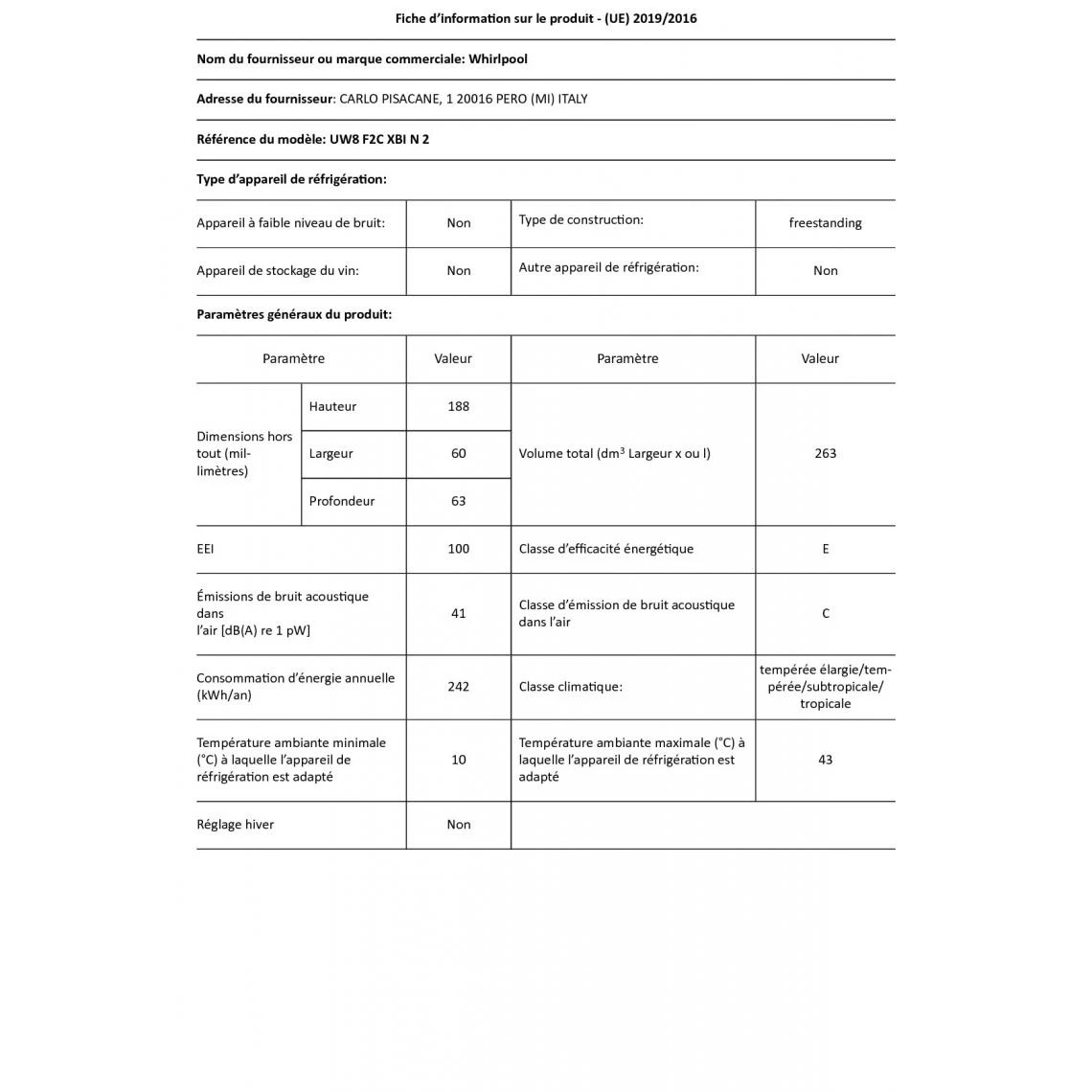 Conso. d’énergie annuelle (kWh/an) : 242.